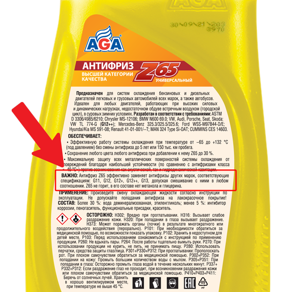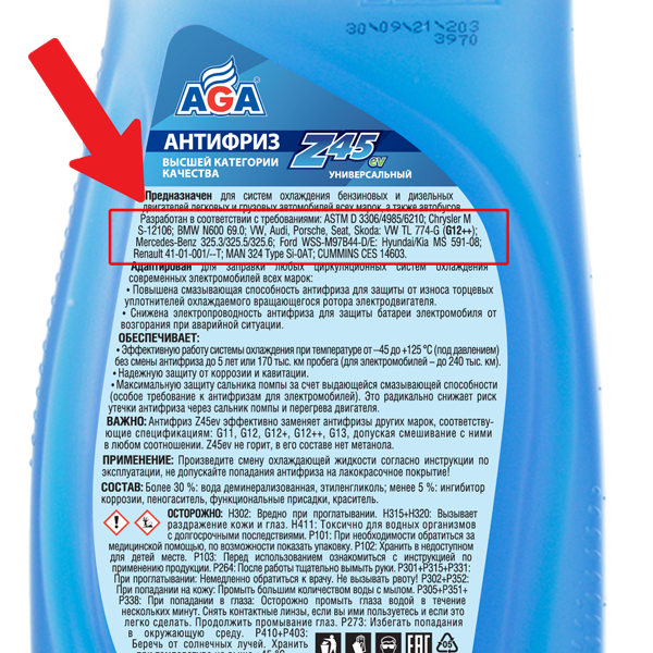 Качественный антифриз выпускается в соответствии с требованиями стандартов на охлаждающие жидкости ведущих мировых производителей автомобильной и специальной техники. Данные об этом тоже указывают на этикетке.