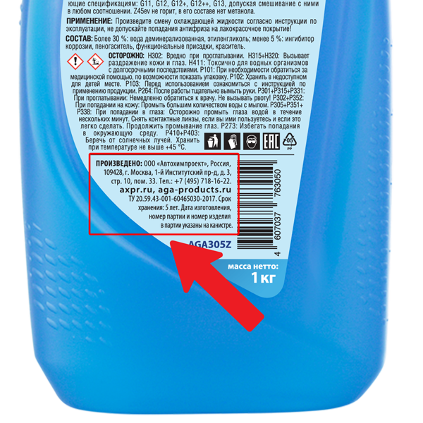 На этикетке должны быть указаны данные производителя с адресом и телефоном, а также срок хранения антифриза: