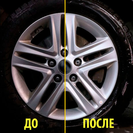 Средство эффективно очищает поверхность, а полимеры на основе силикона глубоко проникают в поры резины, возвращая ей черный цвет и благородный блеск.